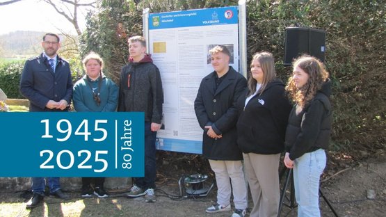 Eine Gruppe von Menschen, Jugendliche und ältere, stehen links und rechts neben der Geschichts- und Erinnerungstafel. Auf der Tafel Text und Abbildungen. Im Hintergrund Hecken und Bäume.